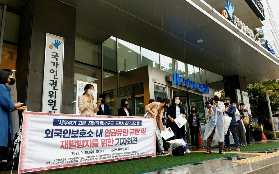 이에 시민사회단체 활동가들과 공익변호사들은 29일 수요일 오전 10시, 서울시 중구 인권위 앞에서 기자회견을 열고 △고문 피해자 ㄱ 씨에 대한 보호해제 △책임자 처벌 및 진상규명 △법무부 장관과 화성외국인보호소장의 사과 및 재발방지대책 마련 △외국인보호소의 무기한 구금문제 및 열악한 보호실태 개선방안 마련 등을 요구했다.