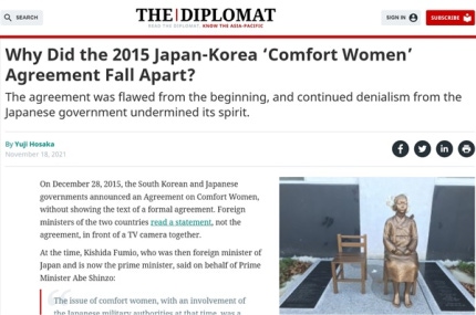 <디플로맷>은 18일자 인터넷판 기사에 한일문제 전문가 호사카 유지 세종대 교수가 쓴 '2015년 한일 위안부합의는 왜 실패했나(Why Did the 2015 Japan-Korea 'Comfort Women' Agreement Fall Apart?)' 제목의 기사를 실었다.