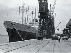 ブラジルのサントス港に停泊する移民船のぶらじる丸。約23万人がこの港から南米に入った。