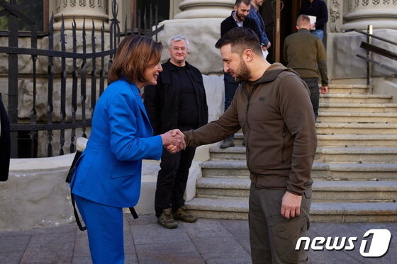 볼로디미르 젤렌스키 우크라이나 대통령이 30일(현지시간) 키이우를 깜짝 방문한 낸시 펠로시 미국 하원의장과 악수를 하고 있다. © 로이터=뉴스1 © News1 우동명 기자
