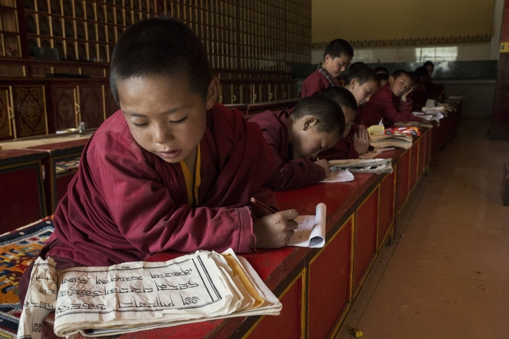 Young monks practice writing Tibetan at a monastery in Yushu, China. Beijing has restricted the teaching and practice of minority languages and religions. | GILLES SABRIE / THE NEW YORK TIMES