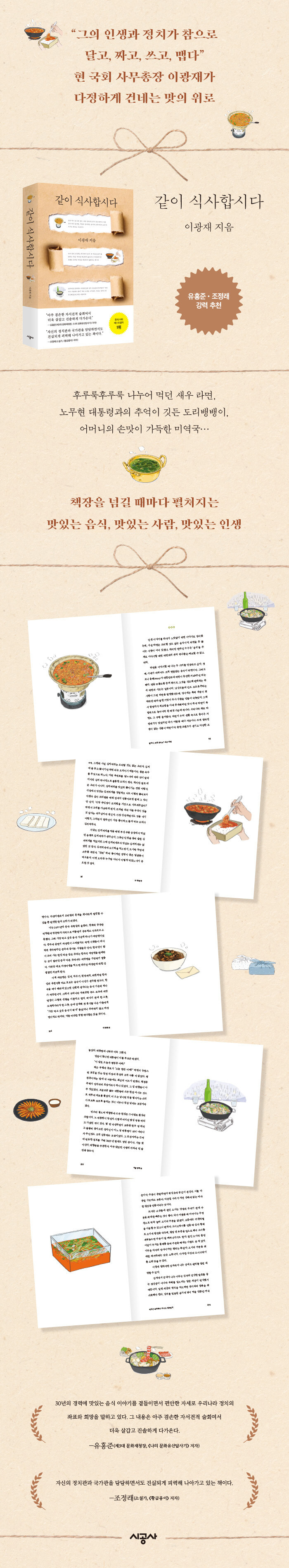 지난 2010년 최연소 강원도지사를 역임하며 정치의 한복판으로 들어온 이광재 제35대 국회 사무총장이 대한민국 국민 모두에게 보내는 뜨거운 밥 한 끼 같은 책이자 10가지 음식에 깃든 자신의 인생 이야기를 에세이 형태로 맛있게 풀어낸 《같이 식사합시다》가 출간되었다. 새우 라면으로 시작해 열무김치에 이르는 10개의 글을 읽다 보면 우리는 이광재라는 사람이 걸어온 (정치적) 인생의 여로를 발견할 수 있다. 그리고 음식에 깃든 그의 인생을 함께 걷다 보면 음식을 만들 때처럼 여러 재료가 모여 각각의 맛을 내는 모습(개별성/다양성)과 그 각각의 맛들이 모여 하나의 맛을 이루어내는 모습(통합성)을 발견할 수 있다. 이는 곧 이광재가 경험했던 음식의 위로, 맛의 위로, 나아가 정치의 위로, 위로의 정치와도 궤를 같이할 것이다.