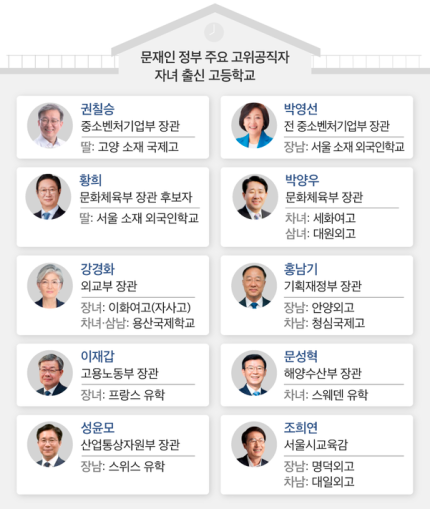 문재인 정부 주요 고위 공직자 자녀 상당수는 자사고나 외국어고를 나왔거나 외국에서 학교를 다녔던 것으로 나타났다. 정권출범 당시 19개 정부 부처 장관 가운데 14명(약74%)이 자녀를 유학 또는 자사고, 외고, 강남 8학군에 있는 학교에 보냈다. 자녀가 없는 진선미 여성가족부 장관을 제외하면 나머지 장관 4명만 자녀들을 일반고에 진학시킨 셈이다. 문재인 정부와 여권은 그간 자사고와 외고를 ‘귀족 학교’라고 비판해 왔고, 진보 교육감들은 자사고 지정을 무더기로 취소했다. 그런데 정작 본인 자녀들은 자사고·외고, 외국 학교를 나온 것이다.