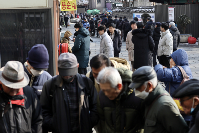 ▲지난 1월 10일 서울 종로구 탑골공원 원각사 노인 무료급식소 인근 식당가에서 점심식사를 위해 시민들이 줄을 서 있다. ⓒ연합뉴스