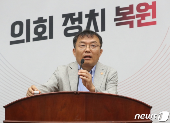 민경우 대안연대 대표가 3일 오후 서울 여의도 국회에서 열린 국민의힘 의원총회에서 ‘야당의 후쿠시마 오염수 괴담·선동’을 주제로 강연하고 있다. 2023.7.3/뉴스1