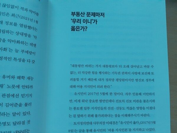 이 책에서 가장 속시원하면서 또 암울한 미래가 걱정인 부분은 바로 문재인 정권의 독선과 오만, 위선과 무능을 비판하는데 있다. 진정한 성찰은커녕 자기 식구 감싸기에 후안무치함을 여실히 드러내는 정치력은 정말 기가 막혀 탄식도 안나올 지경이다. 조국, 윤미향 등 내로남불식 문제를 일으킨 정치인을 마음의 빚이 있다느니 하면서 감싸도는 것은 한마디로 부족주의 그 자체다. 미국 주요 일간지에도 인용된 ‘내로남불’은 현 문재인 정부를 극명하게 드러내는 한마디가 아닐 수 없다. 더하자면 적반하장(賊反荷杖)과 후안무치(厚顔無恥) 정도... 상생과 협치보다 오로지 자신들의 권력을 항구화 하기 위해 혈안이 된 그들에게 문재인 정권은 ‘보수 응징’, ‘적폐 청산’, ‘검수완박(검찰수사권 완전박탈)’을 위해 올인해야 할 뿐이다. 국민은 들러리가 되고 때론 자신들의 이익을 위해서는 철저히 이용되어야 할 존재라는 느낌마저 든다면 어떻게 해명할 수 있을까? 이 책은 그래서 현 정권에 뼈아픈 충고이자 통렬한 비판 그 자체다. 나와 우리가 아니라면 오로지 응징만이 정답인 이들이 진보의 탈을 뒤집어 썼지만 정작 진보는 더 나아진 것이 없다고 저자는 바라보는 것이리라. 과거 저자의 저서 제목처럼 ‘싸가지 없는 진보’는 통렬한 반성이 필요로 하지 않을까?