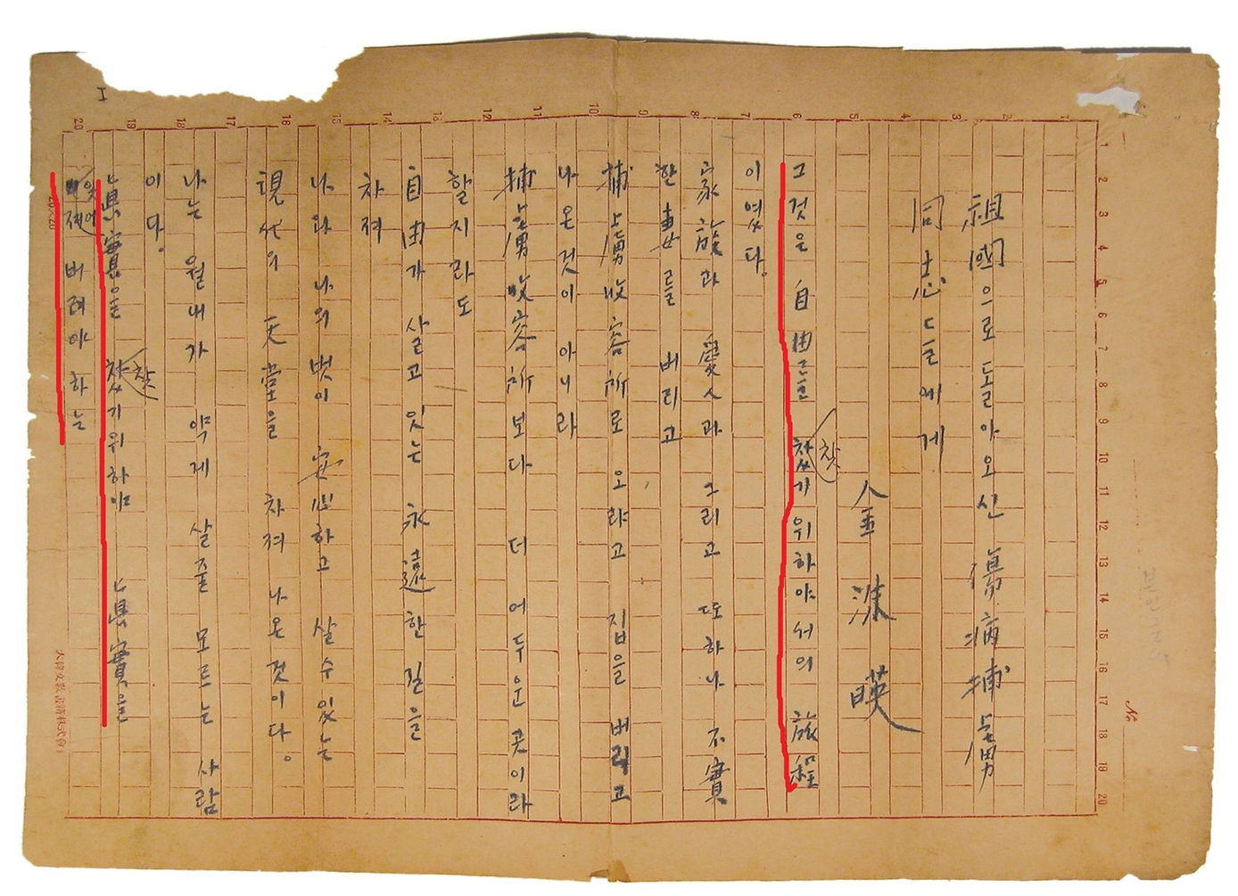 김수영 「조국으로 돌아오신 상병포로 동지들에게」 원고한국평단에서 가장 탁월한 시 독자로 추앙받았던 김현조차 김수영의 시적 주제를 잘못 파악한 듯하다. 김현은 김수영을 세상에 널리 알린 시선집 거대한 뿌리의 해설 「자유와 꿈」에서 첫 문장을 이렇게 시작한다. “김수영의 시적 주제는 자유이다.” 이 유명한 문장은 오랜 기간 김수영 독자들에게 어길 수 없는 금언이었다. 이어서 그는 이렇게 쓴다. “그것은 그의 초기 시편에서부터 그가 죽기 직전에 발표한 시들에 이르기까지 그의 끈질긴 탐구 대상을 이룬다.” 여기까지는 아무런 문제가 없다. 하지만 이어지는 문장은 문제적이다. “그는 그러나 엘뤼아르처럼 자유 그것 자체를 그것 자체로 노래하지 않는다. 그는 자유를 시적 정치적 이상으로 생각하고, 그것의 실현을 불가능케 하는 여건들에 대해 노래한다. 그의 시가 노래한다라고 쓰는 것은 옳지 않다. 그는 절규한다.” 김현의 이 비평문에서 가장 결정적인 문제는 그가 김수영의 자유가 어떤 것인지 전혀 몰랐다는 점에 있다. 김수영 시가 한국문학에서 한 번도 주제화하지 않은 자유의 근본적인 성격을 깊이 탐구하고 있었던 것을 김현은 알 수 없었다. 김현은 자유를 불가능하게 하는 외적인 여건, 사회정치적 현실에 대해 김수영이 분노하고 절규했다고 파악했지만, 김수영은 자신을 그런 피동적이고 수동적인 자리에 두지 않았다. 그는 자유의 외적 여건뿐만 아니라 자유의 내적 조건에 대해서도 탐구하고 있었다.
