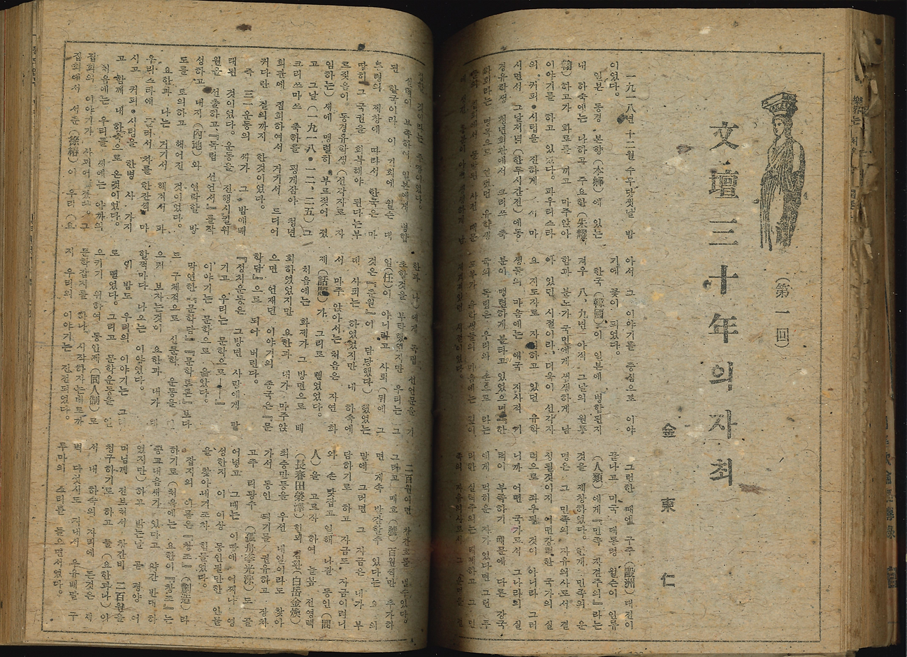 『신천지』 1948년 1월호, 「문단 30년의 자최」소설이라는 장르가 가진 성격에 대해 명쾌한 설명을 제시한 롤랑 바르트는 김동인과 비견되는 견해를 내놓은 바 있다. 바르트에 의하면 과거시제와 삼인칭 대명사라는 마스크의 사용에 의해 소설이 하나의 예술작품으로 성립할 수 있는 조건, 즉 인위적 시간 분절과 세계와의 거리 설정이 가능하게 되었다3). 시간의 선후관계에 질서를 부여하면서 복합적 현상을 하나의 줄거리로 요약하는 과거시제는 그 뒤에 질서의 주재자를 숨기고 있다. 삼인칭 대명사에 의해 지칭되는 인물은 구체적 개인이 아니라 예술적으로 설정된 가상의 인물이며, 그 인물의 행위가 세계와 맺는 관계는 과거 시제에 의해 확정된 사건으로 구체화된다. 즉, 과거시제의 사용은 이러한 과거를 가능하게 하는 어느 시점의 관찰자의 존재를 상정한다는 점에서 삼인칭 화자와 분리불가능하며, 이러한 근대소설에 의해 개인의 내면성이 거주하는 시공간이 확보된다고 할 수 있다. 이러한 서사장치에 의해 독자는, 그것이 비록 추상적이라 할지라도 세계의 전체상에 대한 이해를 얻을 수 있는 관점을 획득할 수 있다. 바르트의 설명에서 흥미로운 것은 과거시제에 의해 가능하게 된 시공간을 만들어내는 주관자가 어떤 신적인 권위를 가진 존재라는 사실이다. 성서적 세계관이 지배하던 전근대적 세계에서 자신이 창조한 세계를 바라보는 신의 존재가 상정되었다면, 근대 세계에서는 삼인칭으로 지칭된 인물이 바라보는 세계가 상정된다. 말하자면 데카르트적 자아가 상정되고, 세계를 자신의 시점에 의해 재구성해서 원근법적 세계를 가능하게 하는 강력한 존재, 바르트의 표현에 의하면 '조물주'가 나타난 셈이다. 이 조물주는 재미있게도 예술적 거리에 의해 상정된 주인공일 수도 있고 이 전체적인 구도를 이끌어가는 화자일 수도 있고 화자를 만들어내고 소설 전체를 조작하는 작가일 수도 있다. 김동인이 소설 쓰기를 인형조종술이라고 말하는 것은 그런 점에서 탁견이다. 이러한 세계는 지금까지의 논의에서 드러났지만 아주 강력한 자아를 상정하지 않고는 불가능한 세계다. 이는 소설의 세계가 근대적 세계라고 불리는 주요 이유 중의 하나다. 하지만 이러한 세계는 한국 문학에서 낯선 세계가 아닐 수 없다.