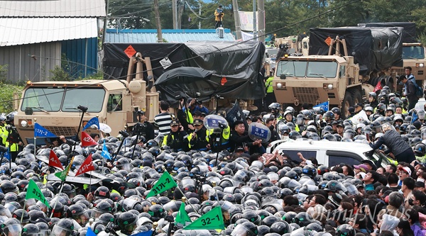 ▲ 2017년 9월 7일 새벽 경북 성주군 초전면 소성리 마을회관으로 미군 사드 발사대 4기가 위장막으로 가려진 채 지나가자 밤새 저지농성을 벌이던 주민과 시민단체 회원들이 연막탄, 참외, 달걀 등을 던지며 항의하고 있다.