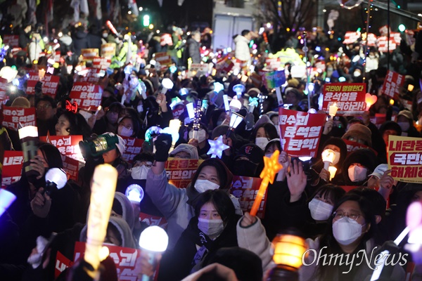 국회에서 윤석열 대통령 탄핵안 표결이 있던 지난 7일, 나도 여의도였다. 기자가 아닌 시민으로 퇴진 집회에 참여했다. 국회 본회의장에서는 범야권 의원들이 여당 의원들의 이름을 하나씩 호명하며 투표를 촉구하고, 국민의힘 의원들은 의원총회를 한답시고 서로가 서로의 이탈을 막는 사실상의 '스크럼'을 짜고 있을 때 시민들은 차디찬 아스팔트 바닥 위에서 "탄핵하라"를 외쳤다. 에스파의 '위플래시'와 소녀시대의 '다시 만난 세계'를 따라 부르는 집회 행렬에는 빛 발하는 응원봉을 든 이가 다수였다. 어둠 속에서 어림잡아도 그 응원봉의 물결이 열에 여섯은 돼 보였다.