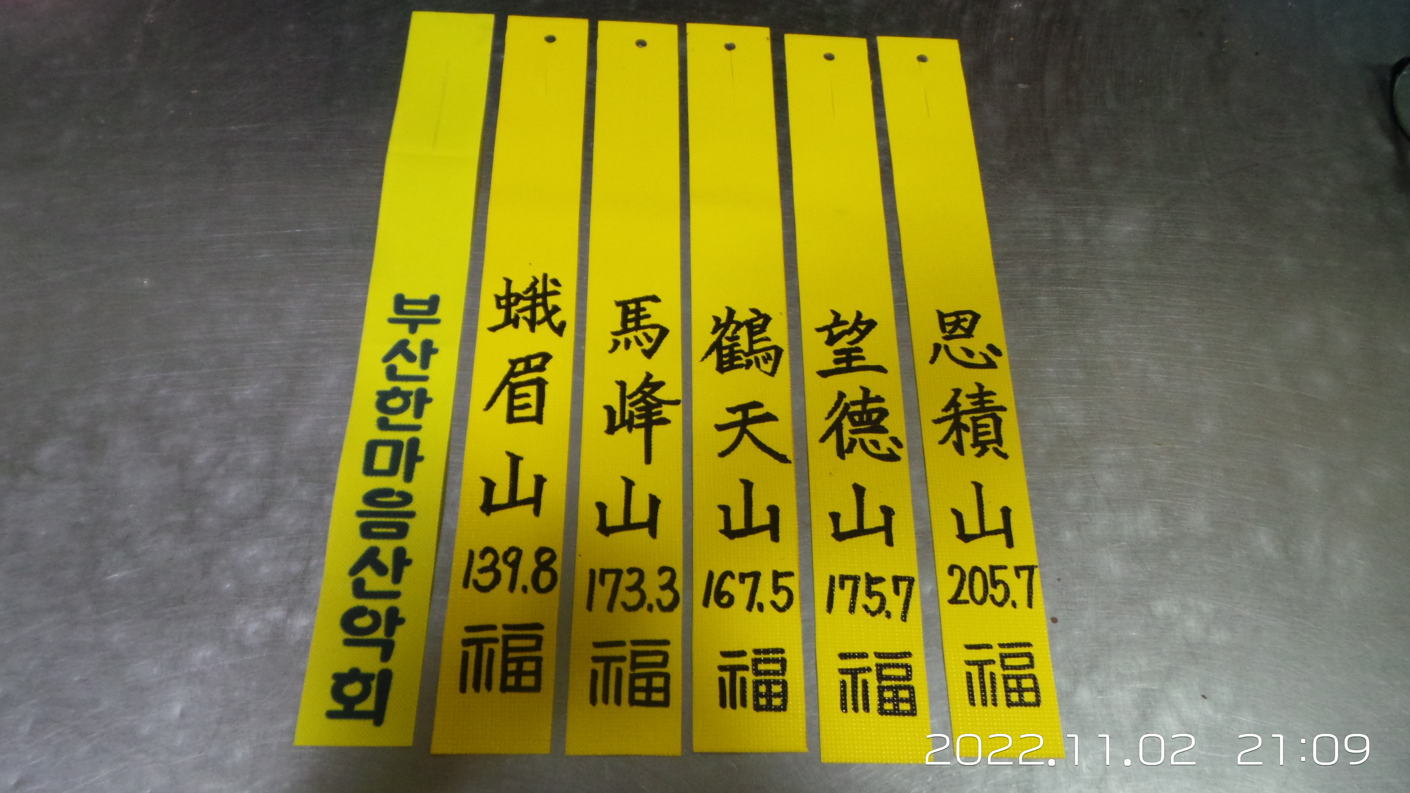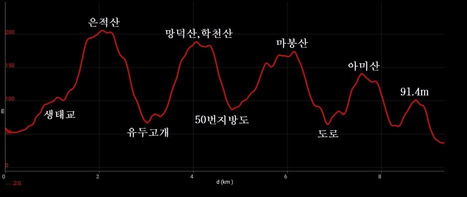2022년 11월 3일. 코스: 연궁교회-생태교-은적산-유두고개-망덕산-학천산-50번 지방도-마봉산-아미산-91.4m-미꾸지-양세오충각(4시간) 궤적. 9km가 조금 넘는 거리에 4시간이 채 걸리지 않았다. 고도표. 미리 준비한 표지기. |