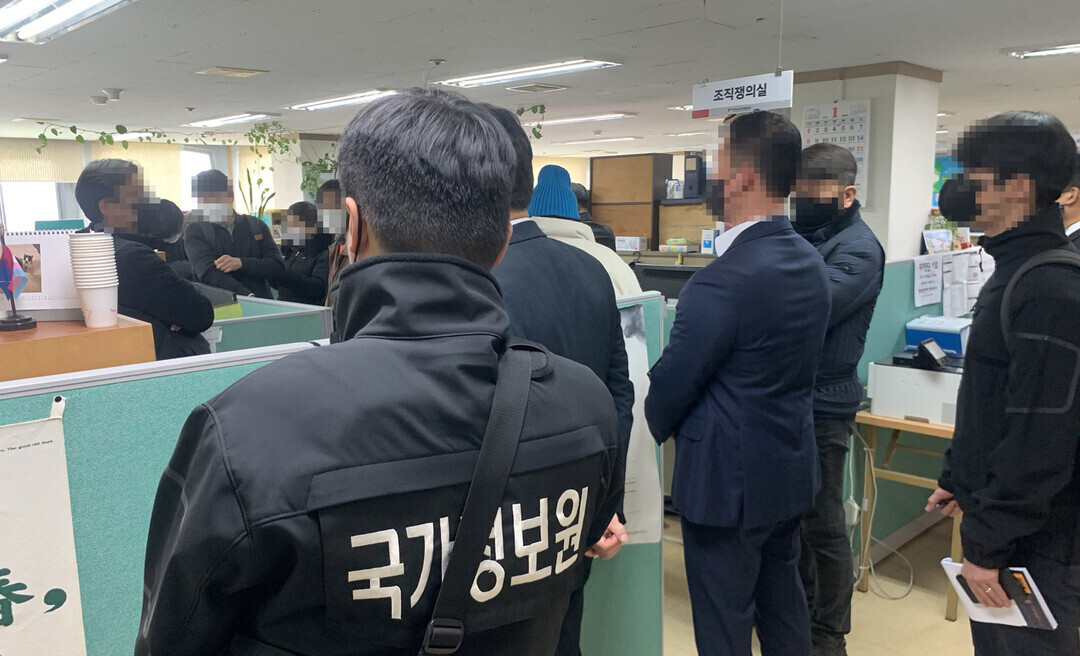 2023년 1월 18일 국가정보원과 경찰청이 서울 중구 정동 민주노총 본부 사무실에 대한 압수수색을 시도하고 있다.[더퍼블릭=양원모 기자] 북한이 민주노총 간부들에게 평택 미군기지 등 주요 요충지 내부 배치도와 같은 기밀 자료를 확보하라는 지령을 내린 것으로 드러났다. 이에 민노총 간부들은 미군기지 내부 촬영물을 확보했으며, 제21대 국회의원 300명의 개인정보를 북한에 넘긴 것으로 확인됐다.