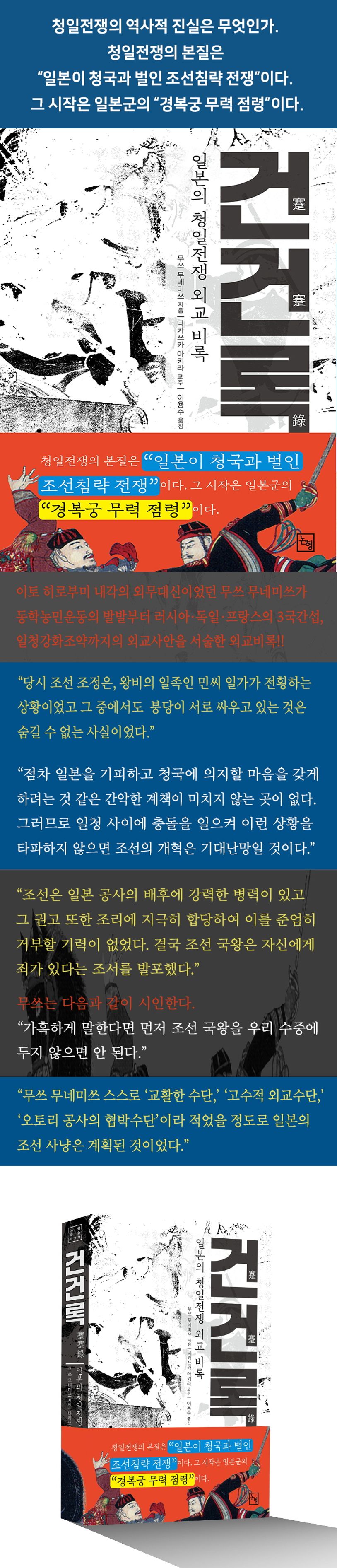 『건건록蹇蹇錄』은 청일전쟁 당시 이토 히로부미 내각의 외무대신이었던 무쓰 무네미쓰가 동학농민운동의 발발부터 러시아ㆍ독일ㆍ프랑스의 3국간섭, 일청강화조약까지의 외교사안을 서술한 책이다. 무쓰 무네미쓰는 ‘외무성의 공문기록을 기초로 하면서도 공식 문서에서 잘 드러나지 않는 진의를 드러내어 외교의 진면목을 다시 알리고자’ 이 책을 썼다고 밝혔으나 일본과 자신에게 불리한 내용은 삭제했다. 새로운 번역과 청일전쟁연구의 권위자인 나카쓰카 아키라의 해설과 교주를 통해 일본이 청일전쟁을 일으킨 최종목적과 청일전쟁의 본질을 꿰뚫어 볼 수 있다.