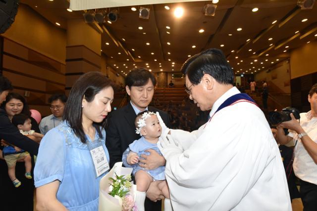 이미지 확대보기갓 태어난 아기들에게 세례를 주는 여의도순복음교회의 헌아식 장면. 여의도순복음교회 제공
