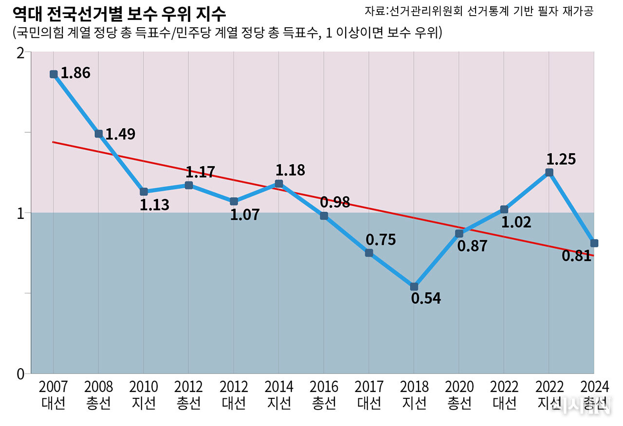 아래 〈그림〉을 보자. 2007년 대선부터 2024년 총선까지 13차례 전국 선거가 있었다(대선 4회, 총선 5회, 지방선거 4회). 이 선거에서 국민의힘 계열 정당이 얻은 총 투표수를, 민주당 계열 정당이 얻은 총 투표수로 나눴다. 이렇게 ‘보수 우위 지수’를 구했다. 이 값이 1보다 크면 보수당의 총득표가 더 많았다는 뜻이다. 이 값이 1.86(2007년 대선)이라는 것은 보수당 득표가 민주당 득표보다 86% 많았다는 뜻이다. 지금부터 몇 단락은 이 데이터에 대한 설명이다. 결론만 알고 싶은 분들은 다음 소제목으로 건너뛰어 읽어도 상관없다.