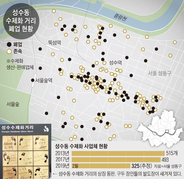 국내 최대 규모의 수제 구두 생산 단지인 서울 성수동 수제화 거리에서 최근 문 닫는 공장이 속출하고 있다. 성수동 수제화 거리는 서울지하철 2호선 성수역을 중심으로 5㎞ 반경에 수제화 공장 300여곳과 부자재 판매상 200여곳이 몰려있는 산업단지다. 지난 1월에는 문재인 대통령이 찾아와 구두를 맞추고 상인들을 격려했다. 최근 복고풍 감성을 타고 카페와 갤러리가 들어서면서 일대가 크게 떴다. 동네 인기는 건물 임대료 상승으로 이어졌다. 경기 불황도 계속됐다. 여기에 최근 제화공들의 공임(工賃·신발 한 켤레를 만들 때 제화공에게 돌아가는 비용) 상승이 덮쳤다. 삼중고에 시달리게 된 업체들이 수십 년 회사를 폐업하고 성수동을 떠나고 있는 것이다.