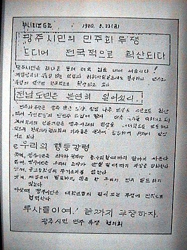 오늘 오후 그들은 드디어 우리를 향해 사격을 가했다. 쓰러지는 우리 학생 시민들 품에 번지는 피! 그들이 우리의 피를 원한다면. 이 조그마한 한 몸의 희생으로 자유라는 대가를 얻을 수 있다면, 나는 희생하겠다. 헬기 소리, 또 총소리. 싸우다 쓰러져간 우리 학우 그리고 광주 시민. 나도 부끄럽지 않게 일어서리라."