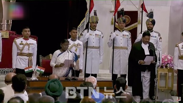 인도 헌정의 상징인 대통령과 대법원장이 선서로 헌법에 대한 충성과 정의 실현을 맹세합니다.
