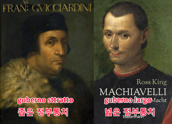 이에 반해 마키아벨리는 <넓은 정부통치·구베르노 라르고guberno largo>를 주장했고, 피렌체의 공화국이 그 케이스였다. 이 넓은 통치는, 아리스토크라트·귀족을 배척하고, 포폴로 그라쏘·그랜드 부르조아에다가 포폴라니·쁘띠 부르조아까지 더하자는 것이다. 따라서 이런 마키아벨리의 공화주의 정치철학은 <3신분 포폴로 부르조아 피플주의·데모크라티아·자유주의의 시원이자 선조이자 원조이다>, 이렇게 나는 본다.