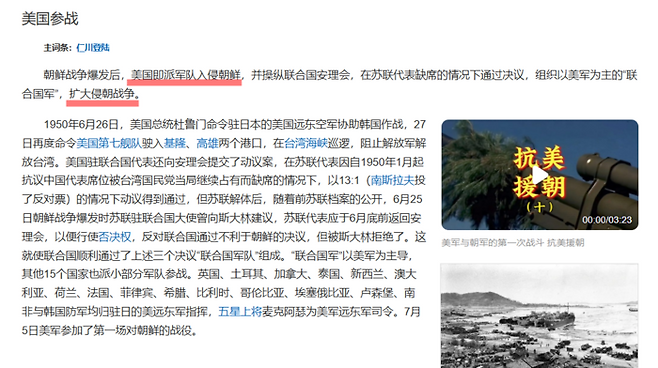 또 바이두 백과는 미국의 참전에 대해 “전쟁이 발발하자 미국은 군대를 파견해 북한을 침략했고, 소련 대표가 참석하지 않은 가운데 유엔(UN) 안전보장이사회에서 결의안을 통과시켜 미군 위주로 구성된 유엔군을 조직해 북한에 대한 침략전쟁을 확대했다”고 서술했다.