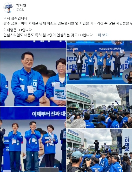 박지원 씨는 5월 17일, 이재명 후보의 광주유세 현장을 보면서 이재명이 DJ라고 주장했다./박지원 SNS 캡처어떤 이들은 이재명 후보의 강력한 당 장악력을 근거로, 그의 리더십이 김대중 전 대통령을 넘어섰다고 주장한다. 권위주의 정권하에서 ‘총재’로 군림했던 김대중조차 야당 시절 지금의 이재명만큼 절대적인 당내 권력을 행사하지는 못했다. 현재 민주당에서 이 후보는 사실상 절대권력자로 자리 잡고 있다.