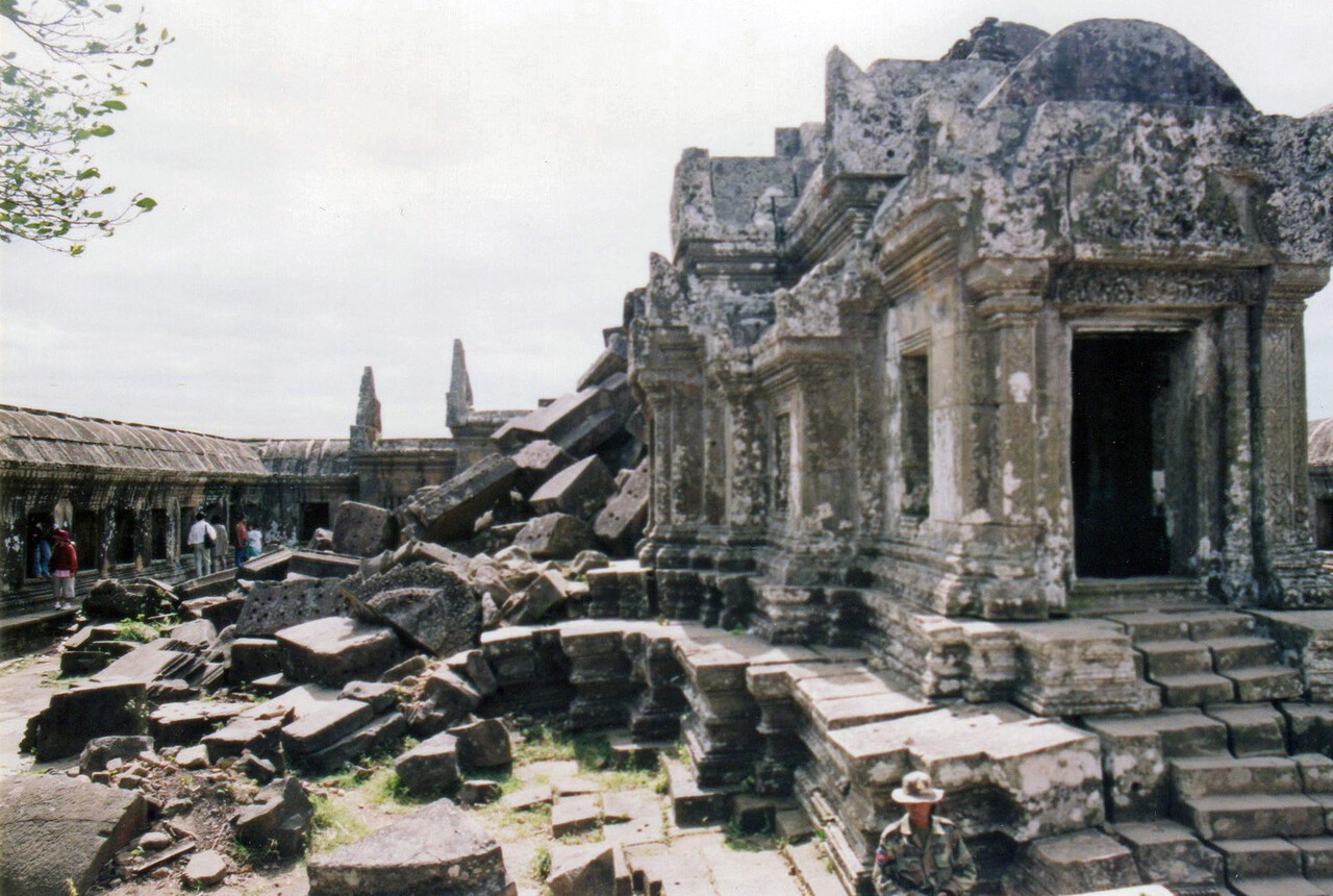 2008년에 캄보디아 측의 세계문화유산 등재를 계기로 그 영유권을 둘러싸고 캄보디아와 태국 사이에 사상자를 낼 정도의 군사 충돌이 일어났다. 그러다 2013년에 분쟁이 진정돼 캄보디아령으로 인정됐다. 9세기에 창건된 이 사원은 12세기 초에 창건된 앙코르와트보다 오래된 사원이다. 지금 남아 있는 부분은 12~13세기에 지어진 것으로, 태국 피마이에 있는 유적을 포함해 크메르 유적들은 모두 앙코르와트 방향을 향하고 있다고 한다. 앙코르와트는 이른바 ‘왕도(王都)의 사원’인 것이다. 현재 이 유적에 접근하려면 앙코르와트가 있는 캄보디아 시엠아프(Siem Reap)에서만 갈 수 있다. 태국 쪽에선 카오프라비한 국립공원을 빠져나가 사원 입구까지 가면 사원 모습을 볼 수 있다. 내가 방문했을 땐 아직 세계문화유산으로 등재되기 전이었고, 아주 짧은 기간 태국 측에서만 발을 들여놓을 수 있던 시기였다.