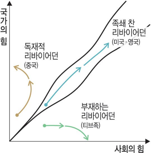 ※글쓴이 주: "좁은 회랑"이란, 아랫그림의 "족쇄찬 리바이어던"과 같은 뜻으로, 2024년 노벨경제학상을 탄, 대런 에이쓰모글루의 학술개념으로써, 정치와 경제가 성공적으로 조화되어 융성번영하는 사회의 조건을 일컫는 낱말이다.