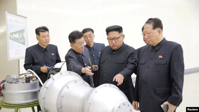 지난 2017년 9월 북한 김정은 국무위원장이 '핵무기 병기화 사업'을 현지지도했다며 관영 조선중앙통신이 공개한 사진. 뒤에 세워둔 안내판에 북한의 장거리탄도미사일 '화성-14형'의 '핵탄두(수소탄)'라고 적혀있다.