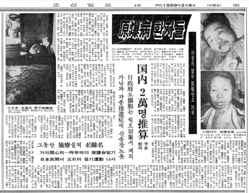 “1964년 8월, 한국원자력원 방사선의학연구소가 피폭자의 신고를 받아 히로시마 피폭자 164명, 나가사키 피폭자 39명의 생존이 밝혀짐.”
