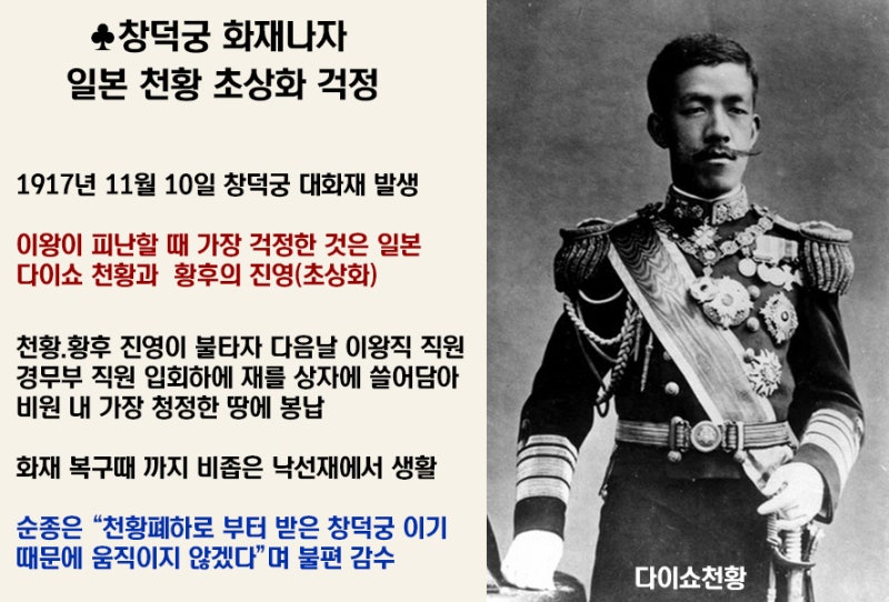 1917년 11월 10일, 창덕궁에서 대화재가 발생했습니다. 순종은 불길이 번지는 와중에도 가장 먼저 '우리 다이쇼 천황의 초상화를 챙겨라'고 지시했습니다. 일본 천황 덕분에 자신이 행복한 삶을 유지할 수 있다고 생각했기 때문입니다. 그러나 불길이 너무 빨리 번져 초상화를 꺼내지 못했고, 결국 초상화는 모두 불타버렸습니다. 순종은 이왕직 직원들을 모두 동원하고 총독부 경무부 직원을 입회 시킨다음 불탄 초상화의 재를 정성스럽게 모아 '비원의 가장 청정한 땅에 봉납했다'고 합니다. 화재 이후 복구를 위해 다른 곳에서 잠깐 동안 생활하시라는 말에 순종은 '다이쇼 천황께서 나에게 창덕궁을 주셨는데, 천황이 주신 이곳을 버리고 내가 어디로 간다는 말이냐' 하며 비좁은 낙선재에서 창덕궁 수리 작업이 끝날 때까지 거기서 생활했다고 전해집니다
