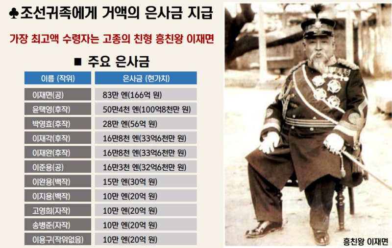 귀족 작위를 수여받은 것만이 아니라, 해당 작위에 상응하는 돈도 지급되었습니다. 가장 많은 은사금을 받은 사람은 흥선대원군의 장남이자 고종의 친형인 이재면으로, 그는 한일 병합조약에 참여한 대가로 83만 엔을 받았습니다. 이를 현재 원화로 환산하면 약 166억 원에 해당합니다. 이재면은 166억 원을 수령한 것입니다. 그 다음으로 이재면의 아들인 이준용은 16만 3천 엔을 받았고, 이는 현재 약 32억 6천만 원에 해당합니다. 따라서 이재면 부자는 총 200억 원 가까운 은사금을 일본 정부로부터 받고, 36년 동안 매우 안락하게 지냈습니다.