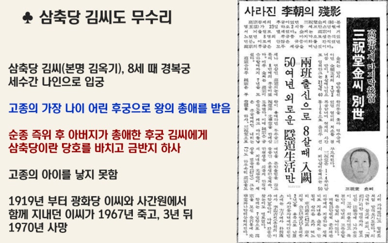 또 이번엔 또 '삼축당 김씨'라는 여성과 또 스캔들이 납니다. 삼축당 김씨라는 여성은 본명이 '김옥기'인데 이 여성은 8살 때 경복궁에 들어온 세수간 나인으로 이 여성도 무수리입니다. 그런데 고종이 여러 궁녀 중에서 삼축당 김씨를 가장 총애를 했다고 합니다. 그래서 순종이 즉위 후에 아버지가 가장 총애한 궁녀 삼축당 김씨에게 '삼축당'이라는 당호를 지어서 바치고 금반지를 하사했다는 기록도 나옵니다. 이 여성은 고종의 아이는 낳지 못했습니다. 이 사람도 해방 후 죽었는데 당시 신문에 부고 기사가 있습니다.