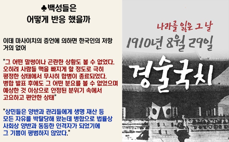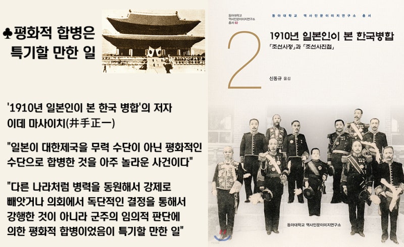 《1910년 일본인이 본 한국 병합》이라는 책의 서문을 이데 마사이치(井手正一)라는 사람이 썼습니다. 이 서문에서 그는 다음과 같이 언급합니다: "일본이 대한제국을 무력 사용 없이 평화적인 방법으로 합병한 것은 매우 놀라운 사건이다." 그는 또한 "다른 나라처럼 군대를 동원해 강제로 빼앗거나 의회에서 독단적인 결정을 통해 강행한 것이 아니라, 군주의 자발적 판단에 의한 평화적 합병이었던 점이 주목할 만하다"라고 설명합니다.
