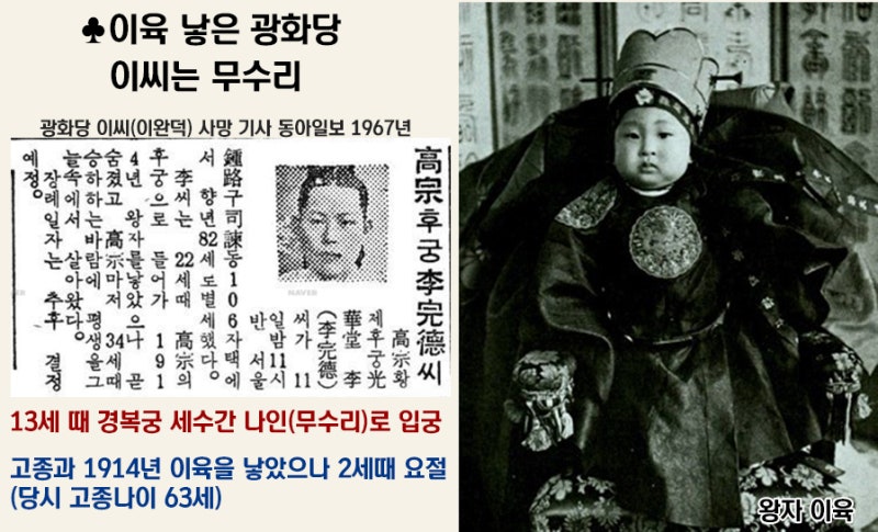 이 여자 한 명뿐이 아니었습니다. 이번에는 '광화당 이씨'라는 여성과 또 동침했는데, 이 여성은 '무수리'입니다. 궁내의 허드렛일을 하는 무수리인 광화당 이씨와 1914년 7월 3일 '이육' 이라는 아들을 낳았습니다. 이때가 고종 나이가 63세로 1914년은 한일합방이 되고 4년 후입니다. 광화당 이씨는 계속 생존하다 해방 후에 죽었다고 동아일보에 기사가 났습니다. 이육이라는 아들은 2살 때 죽습니다. 고종이 너무 많은 나이에 아이들을 낳아서 그런지 건강하게 제대로 자란 아이가 하나도 없습니다.