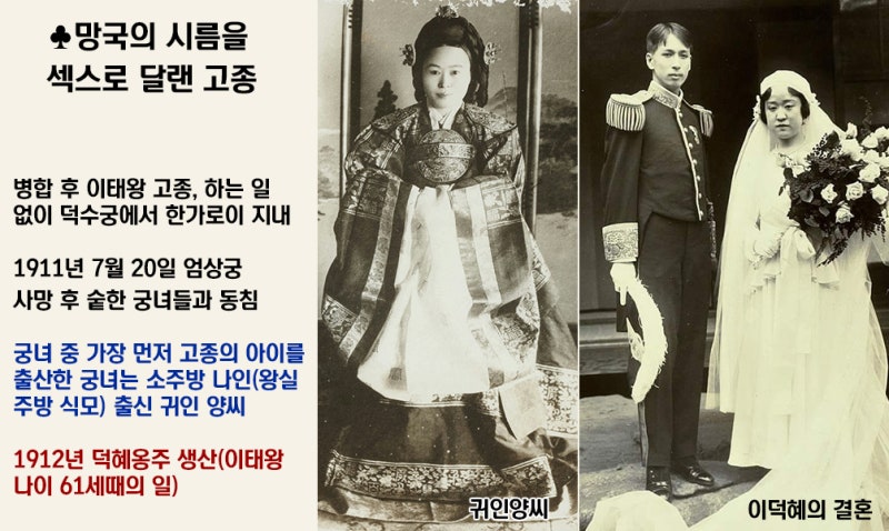 당시 고종의 나이는 61세였는데, 덕혜옹주는 고종의 나이가 많았던 탓인지 정신적인 문제가 있었습니다. 십 대 때부터 조현병이라는 정신질환을 앓으며 많은 고생을 했습니다. 덕혜옹주는 그럼에도 대마도 도주의 아들과 결혼하게 되는데, 이는 그녀가 조선 왕족이라는 신분 덕분에 돈이 많았기 때문입니다. 하지만 정신병은 더욱 심해졌고, 결국 1955년에 이혼하게 됩니다. 고종은 이렇게 일본에서 주는 세비를 받아 덕수궁에서 주방 식모 이런 여자들을 데려다 애 만드는데 아주 열심이었습니다. 이것을 우리가 어떻게 이해를 해야 하겠습니까. 무슨 망국의 시름을 섹스로 푸는것인가요?