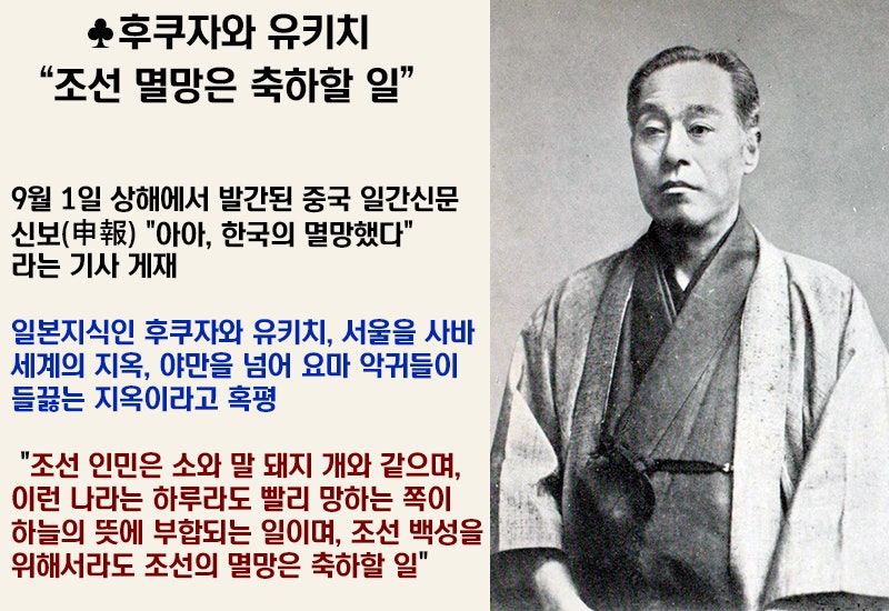 9월 1일, 상하이에서 발간되는 중국 일간지 *신보(申報)*에 '아아, 한국이 멸망했다'는 기사가 실렸습니다. 일본의 근대화 지식인으로 알려진 후쿠자와 유키치(福澤諭吉, 1835-1901)는 훨씬 이전부터 이렇게 말한 바 있습니다. '조선의 인민은 소, 말, 돼지, 개와 같으며, 이런 나라는 하루라도 빨리 망하는 것이 하늘의 뜻에 부합되는 일이다. 조선 백성을 위해서라도 조선의 멸망은 축하할 일이다.' 일본 지식인들은 이처럼 대한제국의 멸망을 바라보고 있었습니다.