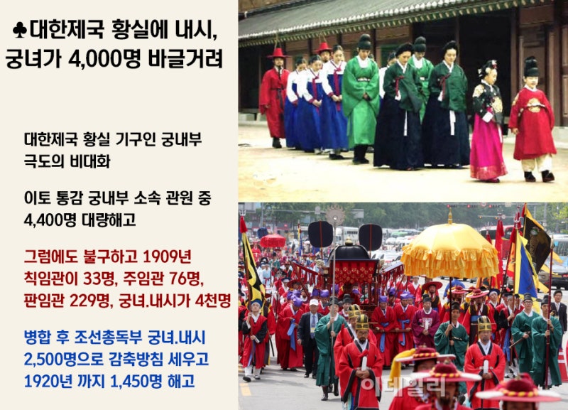 대한제국이 병합되기 전, 황실을 유지하기 위한 황실기구인 '궁내부'가 극도로 비대해져 있었습니다. 이후 통감부가 설치된 이후, 초대 통감 이토 히로부미는 '대체 이놈의 나라는 어떻게 정부 공무원보다 황제를 위한 관리가 더 많냐?'라며 개혁에 나섰습니다. 그래서 궁내부 소속 관원 4,400명을 대량 해고했습니다. 그럼에도 불구하고 1909년에는 칙임관 33명, 주임관 76명, 판임관 229명, 그리고 궁녀와 내시가 4,000명이나 바글대고 있었던 상황이었습니다.한일합방 이후에도, 궁녀와 내시의 수가 지나치게 많다는 지적에 따라 추가적인 인원 감축이 이루어졌습니다. 1920년까지 궁녀와 내시의 정원을 2,000명으로 줄이기로 하고, 1,450명을 해고했습니다.