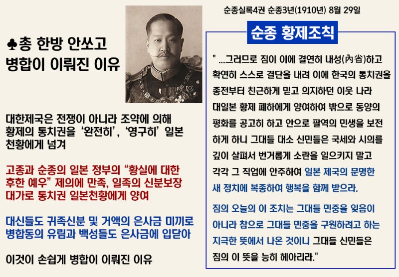 이렇게 된 결과 대한제국과 일본제국의 병합은 총한방 쏘지않고 아주 평온하게 진행될 수 있었습니다.