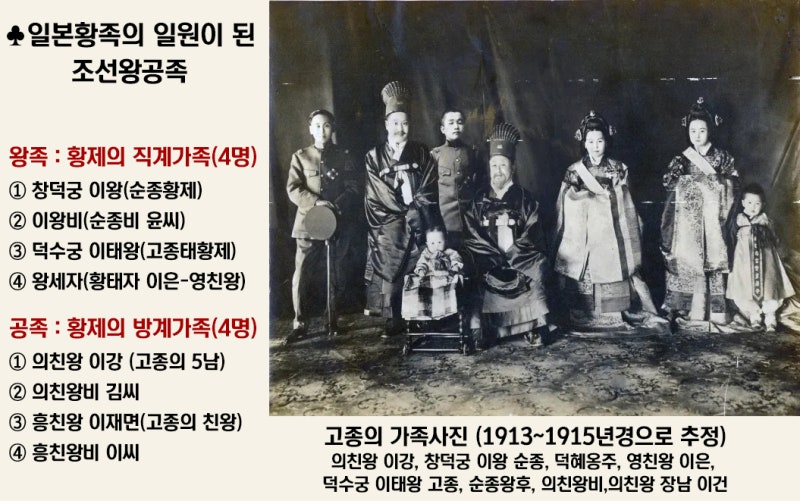 이렇게 망한 나라의 왕족을 일본은 '왕공족'으로 편입시켰습니다. '왕공족(王公族)'이란 고종의 직계 가족을 '왕족(王族)', 방계 가족을 '공족(公族)'이라 부르며, 이를 합쳐 부르는 명칭입니다. 왕족에는 순종 황제와 그의 부인, 고종 황제와 그의 부인, 이렇게 총 4명이 포함되었습니다.