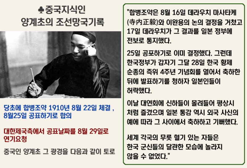 원래 합병 조약은 1910년 8월 22일에 체결하고 8월 25일에 병합을 공표하기로 합의되었습니다. 그러나 대한제국 측에서 갑자기 연락이 와서 공표 날짜를 8월 29일로 연기해달라고 요청했습니다. 왜 4일을 연기했는지에 대한 이야기는 중국 지식인 양계초(梁啓超, 1873-1929)가 쓴 조선 망국을 논함이라는 책에 나옵니다. 그는 이렇게 기록했습니다.