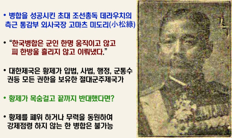 위 사진의 통감부 외사국장을 지냈던 고마츠 미도리(小松綠, 1865-1942)는 이렇게 말했습니다. "우리는 군인 한 명 안 움직이고 피 한 방울 안 흘리고 대한제국을 병합하는 데 성공했다."