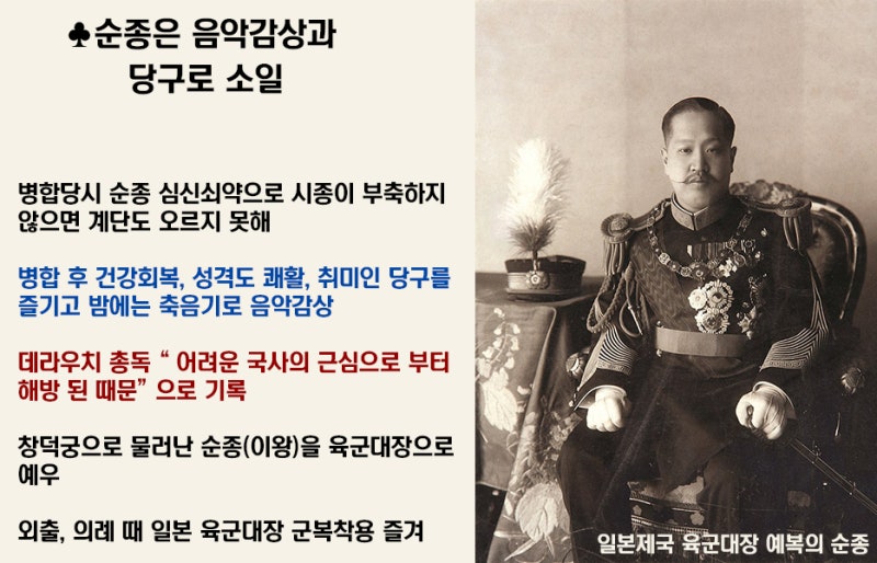 병합 당시만 해도 순종은 심신이 쇠약해서 시종들이 좌우에서 받쳐주지 않으면 계단도 자기 스스로 걸어 올라가지 못할 정도로 아주 병약한 인물이었습니다. 그런데 한일병합 후에 일본 황실에서 보낸 최고 의료진들의 도움을 받아서 건강을 회복했다고 합니다. 그래서 성격도 쾌활해졌고 취미인 당구를 너무나 즐겼으며, 고급 축음기를 가져다가 음악 감상에 빠져 있었다고 합니다.