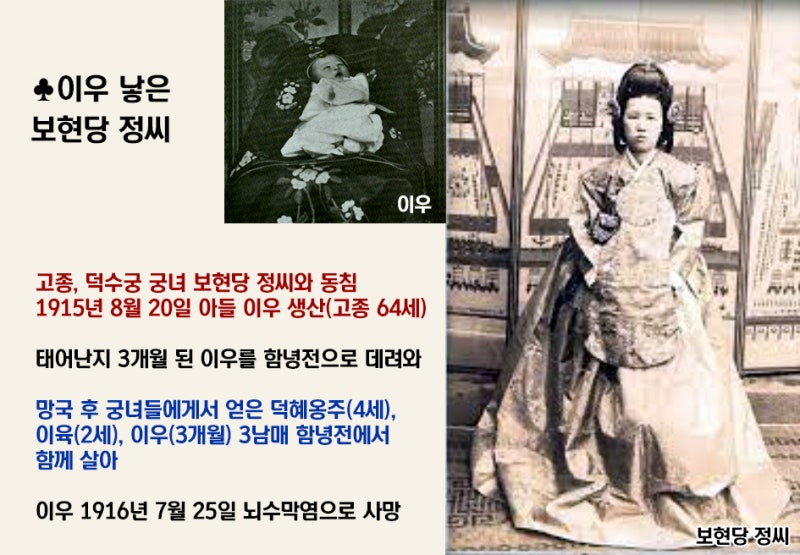 그리고 고종은 또 아이를 낳았는데, '이우'라는 아이입니다. 이 아이는 ‘보현당 정씨’라는 여성에게서 낳았는데 1915년 8월 20일 고종이 64세 때 낳았습니다. 하지만 1916년 7월 25일 날 내막염으로 죽습니다. 그래서 이렇게 한일합방 이후 결국 아들 2명과 딸 1명 이렇게 3명을 낳았는데 딸인 덕혜옹주는 정신병 문제가 있었고 아들 2명은 어린 시절 모두 죽습니다.