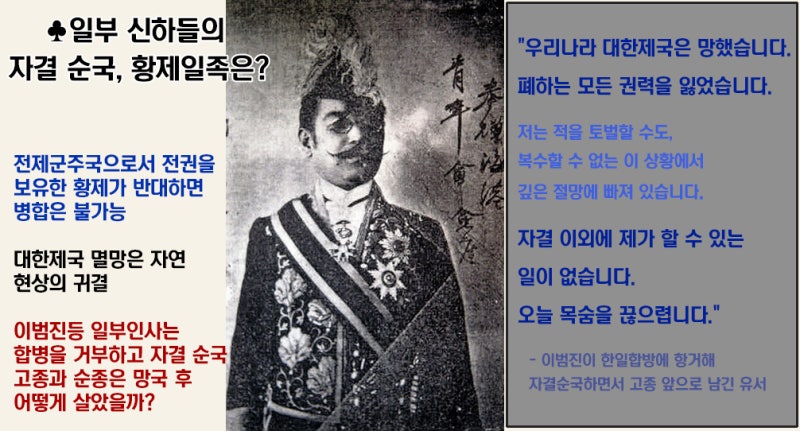이범진이라는 인물이 주러시아 공사관에 있을 때 병합 소식을 듣고 자결한 사례가 있습니다. 그는 다음과 같은 유서를 남겼습니다: '우리나라 대한제국은 망했습니다. 폐하는 모든 권력을 잃었습니다. 저는 적을 토벌할 수도 복수할 수 없는 이 상황에서 깊은 절망에 빠져 있습니다. 자결 이외에 제가 할 수 있는 일이 없습니다. 오늘 목숨을 끊으렵니다.' 그는 실제로 자결하였습니다. 다른 선택의 여지가 없었던 상황이었습니다. 황제가 나라를 돈 받고 넘겼고, 백성들조차 합병을 기쁘게 받아들였으니 말입니다.