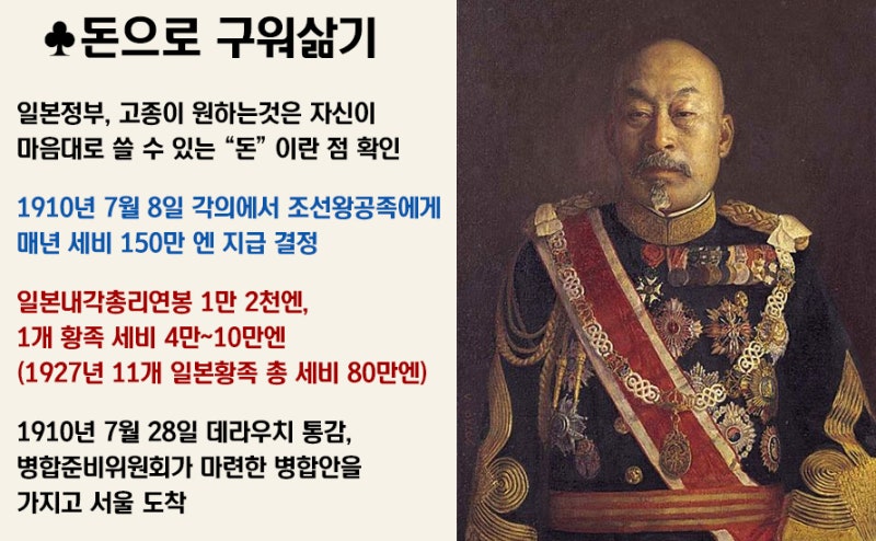 이는 일본 입장에서 볼 때도 상상하기 힘든 거액이었고 그야마로 "헉" 소리가 나는 금액이었습니다.. 그들은 이 막대한 금액을 고종과 순종(純宗, 1874-1926)에게 지급하기로 결정했고, 이 결정을 담은 안을 가지고 1910년 7월 28일, 데라우치 마사타케(寺内正毅, 1852-1919)가 조선에 도착했습니다.