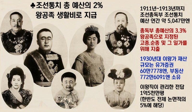 조선총독부는 왕공족을 관리하기 위해 '이왕직'이라는 부서를 따로 두었으며, 이왕직이 관리한 전답과 농토는 한반도 전체 논 면적의 5%에 해당하는 넓이였습니다. 이를 통해 조선 왕공족이 얼마나 부유했는지 짐작할 수 있습니다. 다시 말해, 일본은 고종과 순종을 돈으로 완전히 구워 삶은 것입니다.