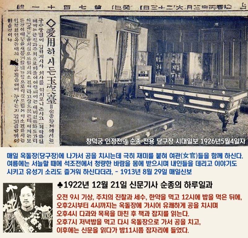 1913년 8월 29일 자 매일신보에 이런 기사가 났습니다. "순종 이왕께서 '옥돌장(당구장)에 나가서 공을 치시는데 극히 재미를 붙여 여관들을 함께 하신다. 여름에는 서늘할 때 석조전에서 청량한 바람을 몸에 받으시며 내인들을 데리고 이야기도 시키고 유성기 소리도 즐거워하신다더라." 즉, 궁녀랑 당구 치고 음악 감상하면서 아주 해피하게 잘 살았다는 그런 기록입니다.