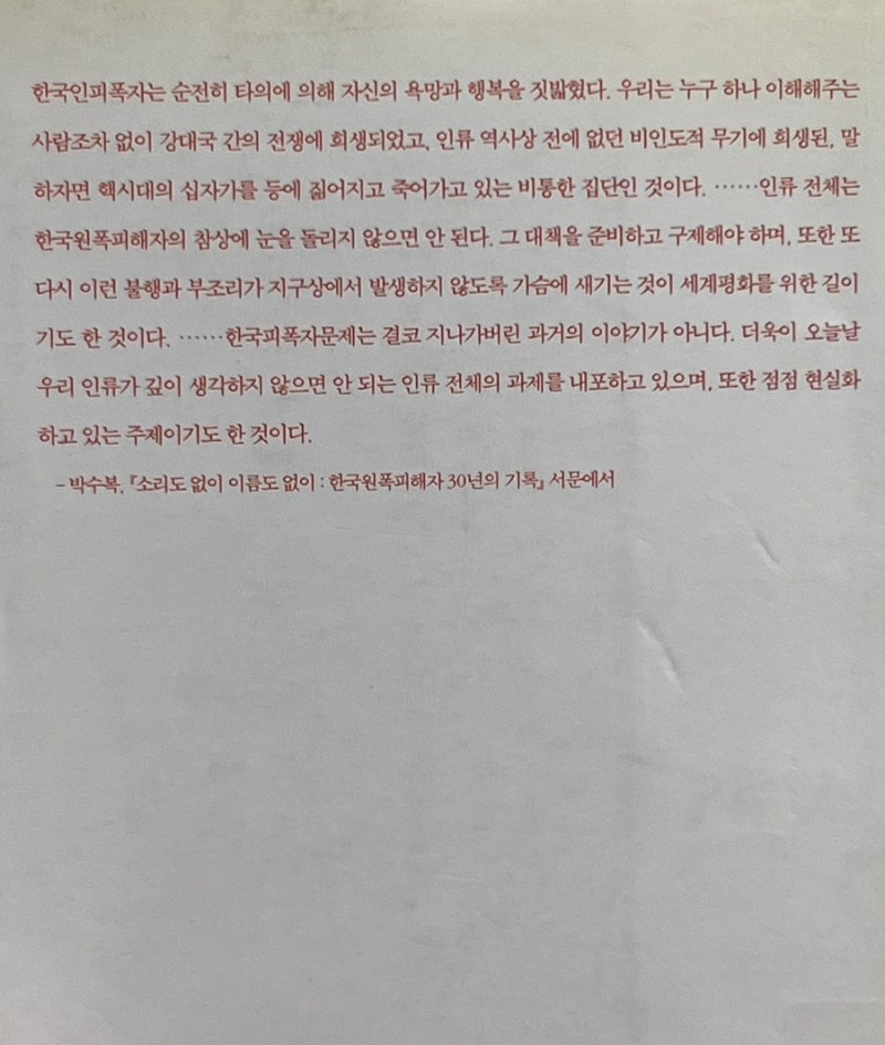 한국피폭자문제는 결코 지나가버린 과거의 이야기가 아니다. 더욱이 오늘날 우리 인류가 깊이 생각하지 않으면 안 되는 인류 전체의 과제를 내포하고 있으며, 또한 점점 현실화하고 있는 주제이기도 한 것이다. (박수복, 『소리도 없이 이름도 없이 - 한국원폭피해자 30년의 기록. 서문에서)