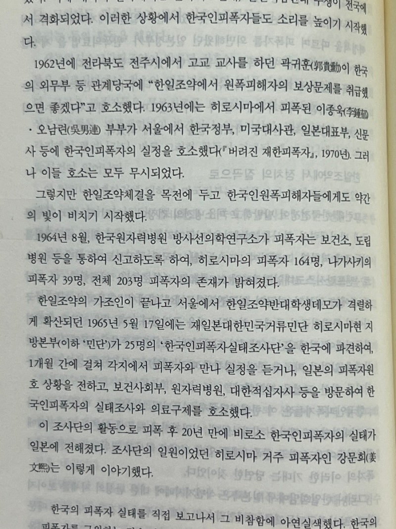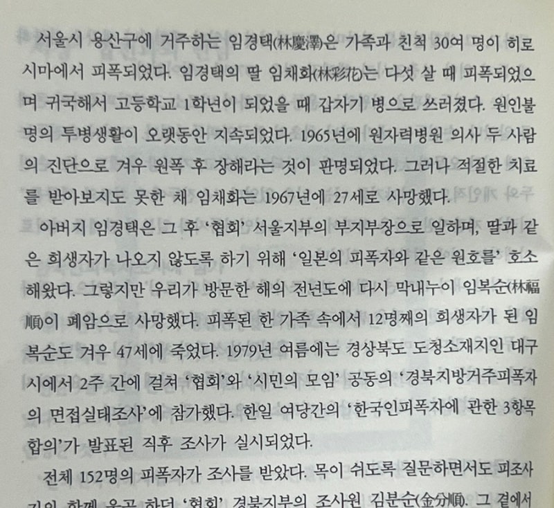 '한국인피폭자의 실태조사에 참가하여 절실히 느낀 것은, 한국인피폭자가 원폭피폭에 관하여 말하기 전에 '왜 일본의 히로시마, 나가사키에 갔었는가‘에 관하여 말하지 않으면 이야기를 시작할 수 없다는 사실이다. 그것은 일본인피폭자의 피폭체험에 관한 이야기와 많이 다르다.