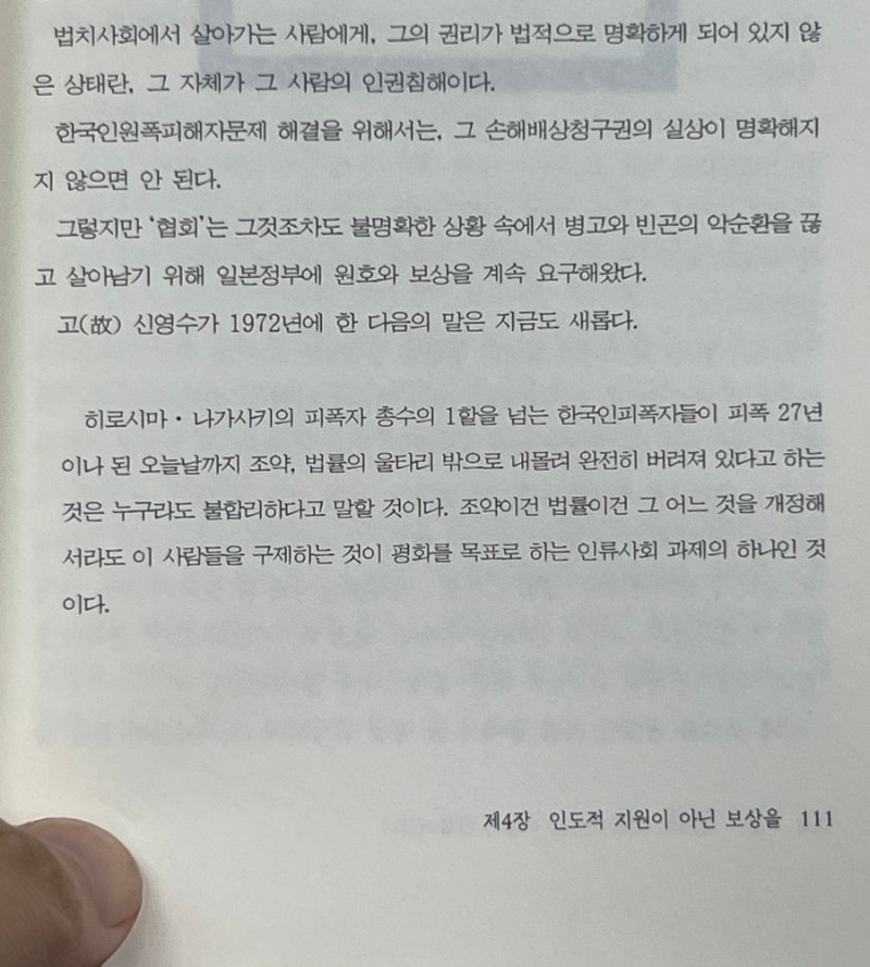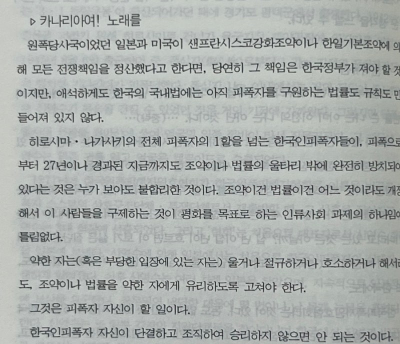 한국피폭자는 순전히 타의에 의해 자신의 욕망과 행복을 짓밟혔다. 우리는 누구 하나 이해해주는 사람조차 없이, 강대국 간의 전쟁에 회생되었고, 인류 역사상 전에 없던 비인도적 무기에 희생된, 말하자면 핵시대의 십자가를 등에 짊어지고 죽어가고 있는 비통한 집단인 것이다......
